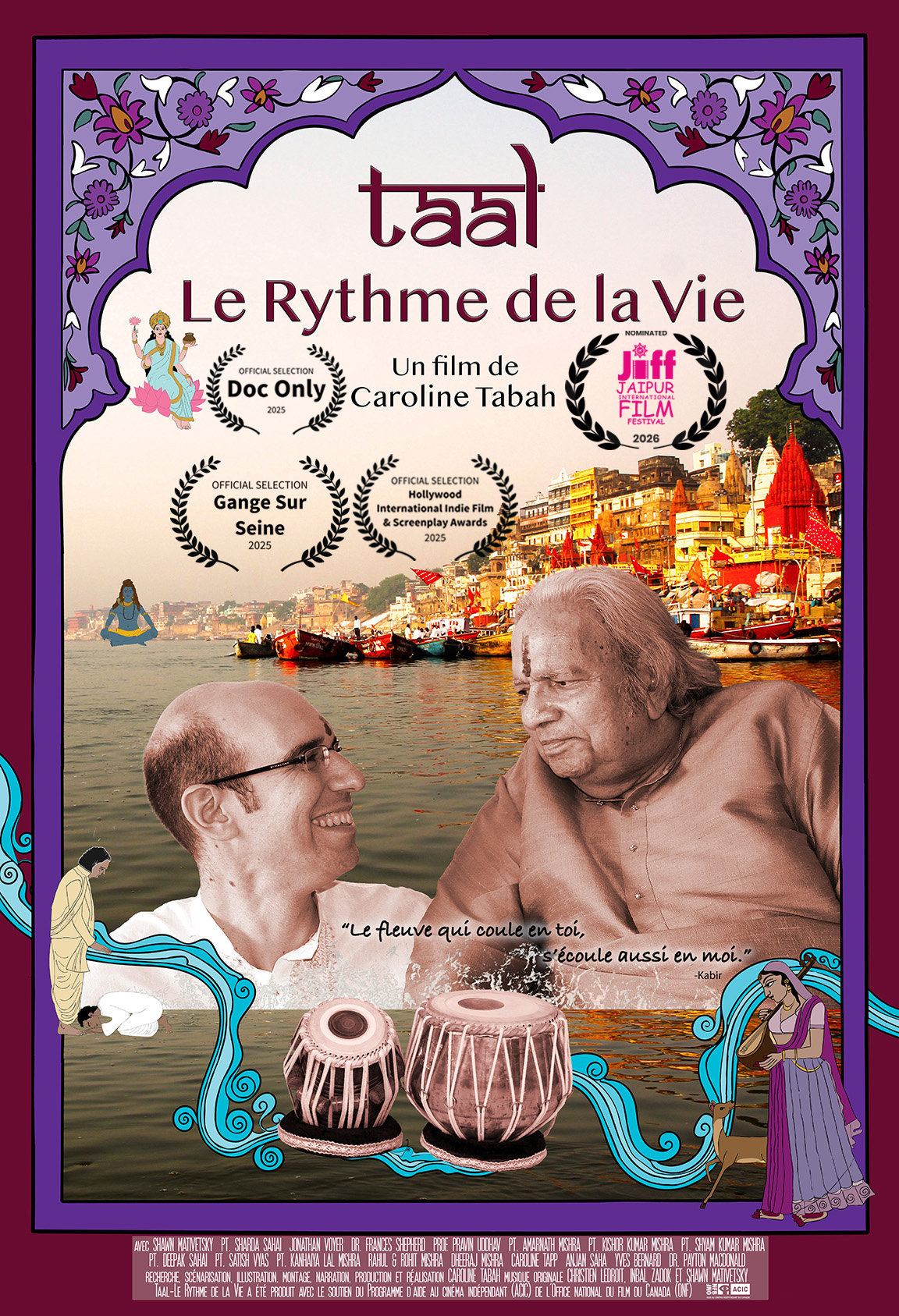 Réalisé sur une période de 12 ans et tournée principalement à Varanasi, à Montréal et à Londres, le film-fleuve, trilingue, Taal – Le Rythme de la Vie, porte sur la relation entre le maître de musique et son étudiant, dans le cadre de l’apprentissage de la musique classique de l’Inde du Nord, et en particulier, dans la tradition de tabla de la ville sacrée de Varanasi (Bénarès). Une transmission prodiguée oralement qui excède le cadre d’apprentissage de la musique occidentale car on y enseigne aussi la vie. Le principal fil conducteur du documentaire, qui est ponctué d’animation et de fables de l’Inde, est le percussionniste montréalais Shawn Mativetsky, dans sa relation avec le légendaire virtuose du tabla, Pandit Sharda Sahai.